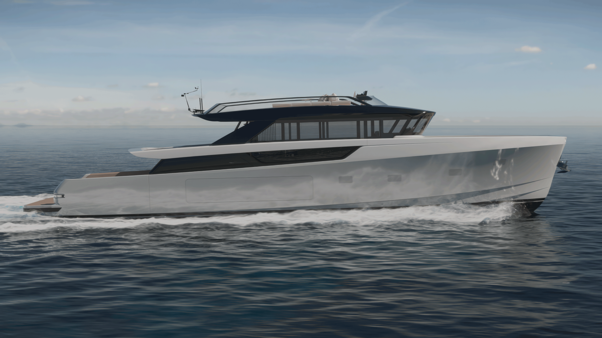 The spectacular aft salon entrance creates a unique onboard flow, linking the water directly to the heart of the yacht. The helm station, now located on the flybridge under a sleek hardtop, frees up the interior and offers an elevated and open navigation with an incredible panoramic view. At the stern, a hydraulic platform with side openings transforms the beach area into an expansive relaxation zone on the water.